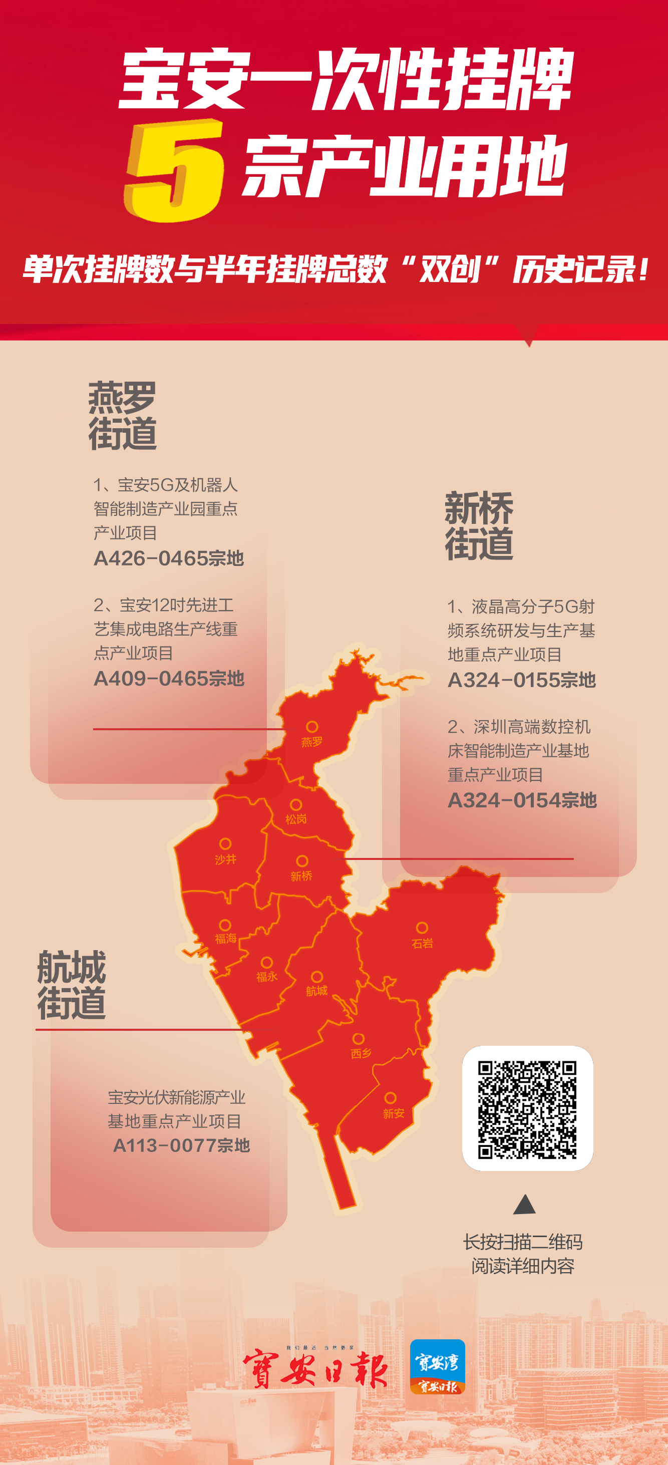 7月1日,上午9点,宝安在深圳土地矿业权交易平台一次性发布5宗重点产业项目土地使用权出让公告,至此上半年累计挂牌8宗产业用地,单次挂牌数与半年挂牌总数“双创”历史记录。