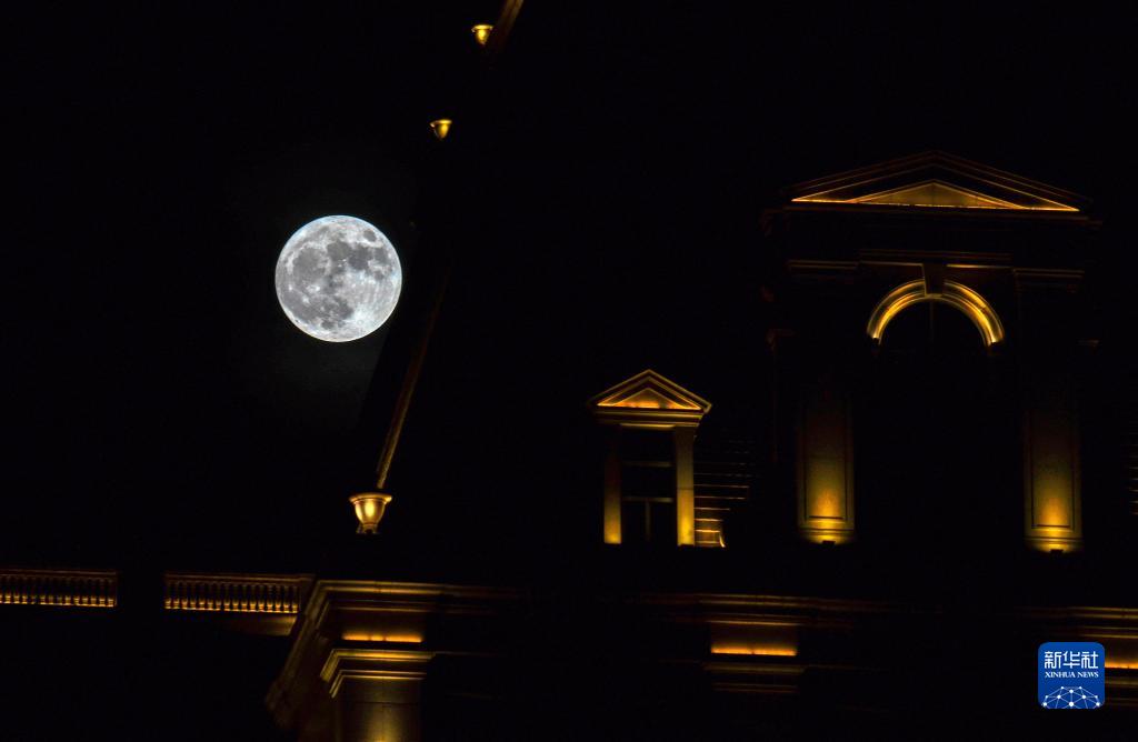 7月13日,“超级月亮”现身贵州省贵阳市地标性建筑花果园艺术中心上空。