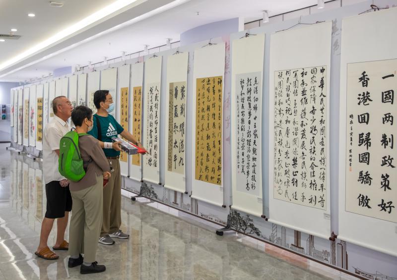文艺演出结束后,活动进入观看庆祝香港回归25周年“手牵手、笔墨情”书画摄影展览和茶点会环节。书画摄影展览在艺术中心一楼展出,共征集到46幅作品,大部分为香港和居住松岗的同乡会会员和乡亲的作品,作者利用书法、美术、摄影等艺术形式,表达了“两岸一家亲”和“爱国、爱港、爱乡”的真实情感。大家品尝家乡茶点,欣赏艺术作品,畅谈未来发展,氛围热闹而亲切。
