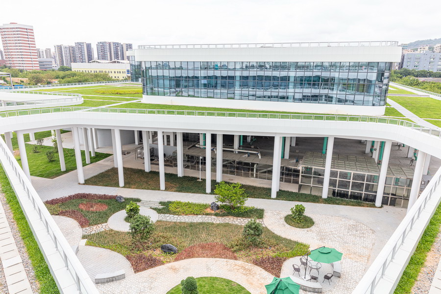 双层上盖叠加出层层退台,将厂区结构与周边景观带巧妙融合,与大海碰撞出“绣海碧滩”的城市景观带,充分体现了“生态”“人文”的场所精神。