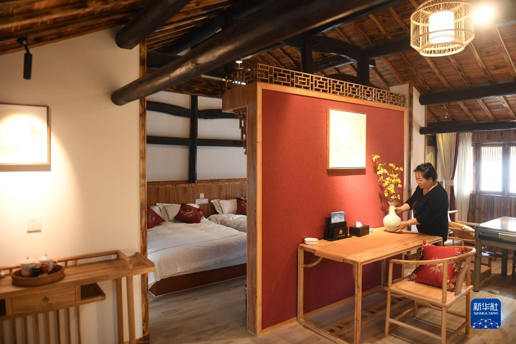 服务员在浙江省磐安县乌石村一家民宿内整理房间(2019年4月24日摄)。新华社记者翁忻旸摄