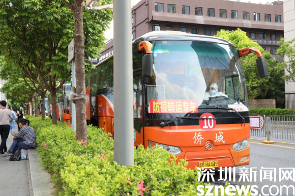 在小区外,一排防疫转运专车停靠路边,工作人员有序引导小区的居民登记上车。