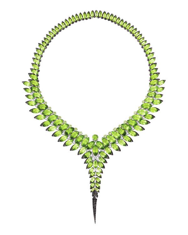 此外,橄榄石不仅是珠宝首饰材料,也可化身服装、腕表及摆件的组成部分。乘着设计师、艺术家的无穷想象力,橄榄石与多媒介、多材质相结合,碰撞出斑斓旖旎的时尚表达——让这一抹鲜亮的绿色,成为游走于日常生活的独特色彩。