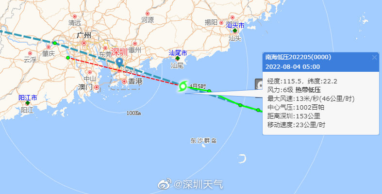 深圳市气象台2022年08月04日09时55分发布:南海热带低压已于4日09时40分前后在广东省惠东县沿海登陆,登陆时中心附近最大风力有6级(13米/秒),中心最低气压1002百帕。预计,热带低压将以15~20公里的时速向西偏北方向移动,强度逐渐减弱。今天白天至明日上午我市仍降雨频密,累计雨量可达暴雨局部大暴雨,沿海海区和高地伴7-8级阵风。