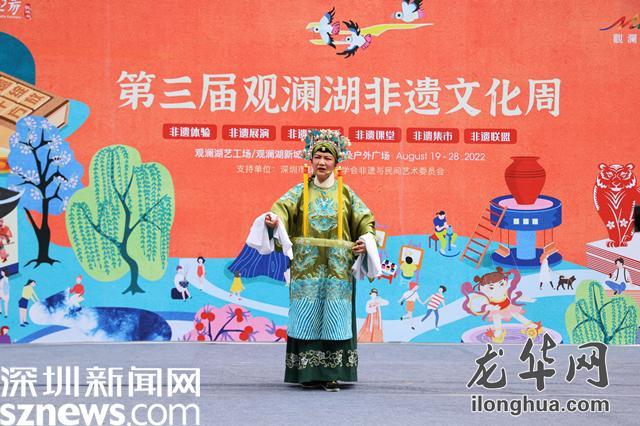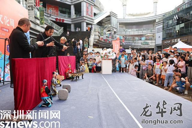 非遗文化周开幕式地点位于观澜湖新城星空广场,这里霓虹闪烁,汇聚各类时尚业态,夜间消费非常旺盛。“之所以选择在这个深圳北重要的时尚潮地开幕,就是为了凸显我们连接现代生活这个主题。”观澜湖手艺工场总经理陈亚东表示。当天,多位来自泉州等地的提线木偶非遗技艺传承人来到现场表演,期间还走下舞台与观众互动,诙谐逗趣的提线木偶让市民们感觉非常新奇。手艺工场内,几位教授皮影戏的老师带领着学生为市民奉上了精彩的传统皮影戏表演。此外,京剧、古琴演奏等视听类非遗文化项目逐个在舞台上呈现。