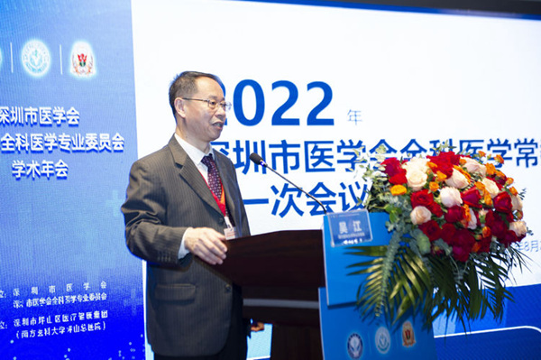 市卫健委基层处向炜调研员、市医学会罗晓琼常务副会长、市医学会全科医学专业委员会夏俊杰名誉主委、南方医科大学坪山总医院冯天元院长出席全科医学专业委员会学术年会并发表致辞。