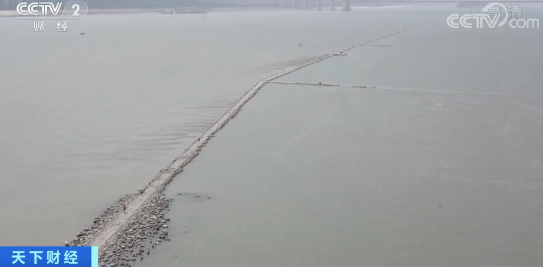从航拍画面中可以看到,这条“江心小路”两侧铺着碎石,将江水一分为二。