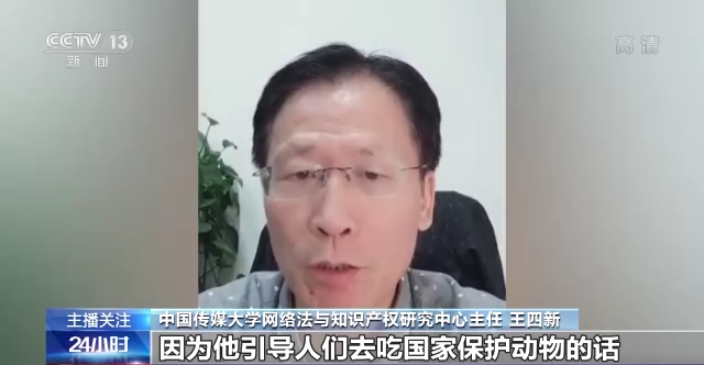 中国传媒大学网络法与知识产权研究中心主任王四新:因为他引导人们去吃国家保护动物的话,势必会导致国家保护动物遭受更多人的捕猎,遭受更多濒临灭绝的危险,也会诱导人们形成不正确的吃东西的方式。