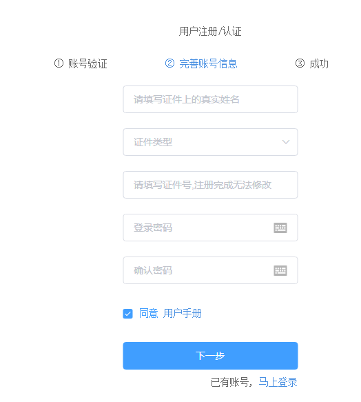 5.提交后进入注册成功提示页面,可使用注册时手机号或者证件号完成登录。