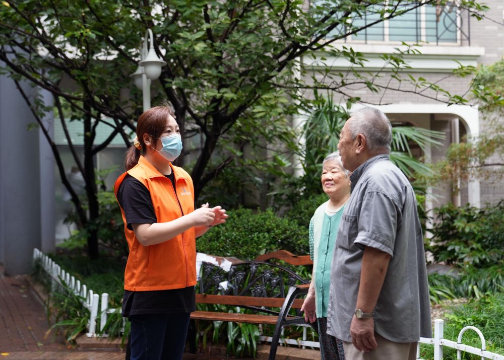 在上海静安区石门二路街道新福康里,居民区党总支书记魏瑛(左)在和居民交流(2022年9月15日摄)。新华社记者 刘颖 摄