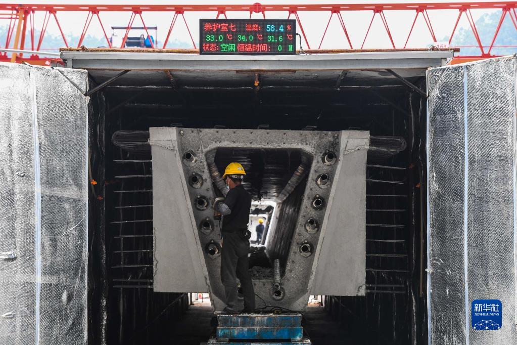 10月18日,工人在黄茅海跨海通道智慧梁场绑扎预制箱梁钢筋笼。