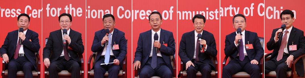 10月19日,中国共产党第二十次全国代表大会新闻中心举行集体采访。山东、河南、湖北、湖南、广东、广西、海南代表团新闻发言人出席,介绍代表团学习讨论二十大报告情况,并回答记者提问(拼版照片)。