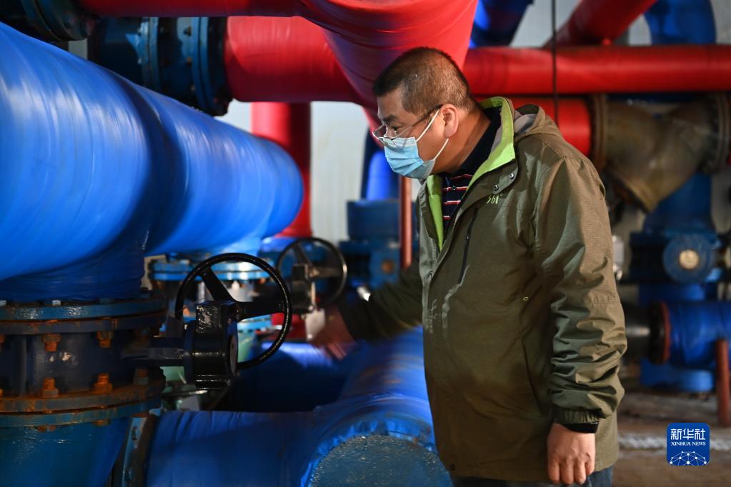 10月20日,在黑龙江省哈尔滨市呼兰区一家供热企业,工作人员在换热站内查看仪表数据。
