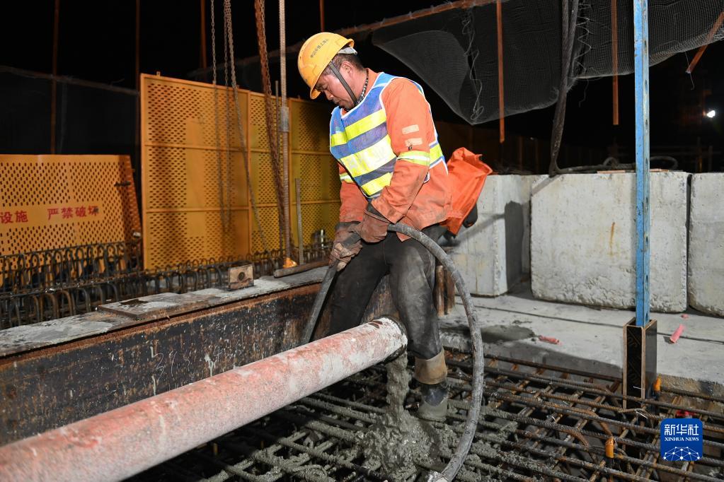 10月20日凌晨,工程技术人员在杭温铁路二期工程跨杭黄铁路特大桥最大跨度连续梁施工现场作业。