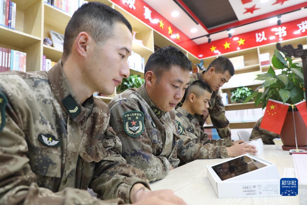 中共中央总书记、国家主席、中央军委主席习近平24日下午出席军队领导干部会议时发表的重要讲话,在解放军和武警部队引起强烈反响。这是新疆军区奥尔托苏边防连官兵在图书室认真学习习主席重要讲话(10月25日摄)。新华社发(刘南松 摄)