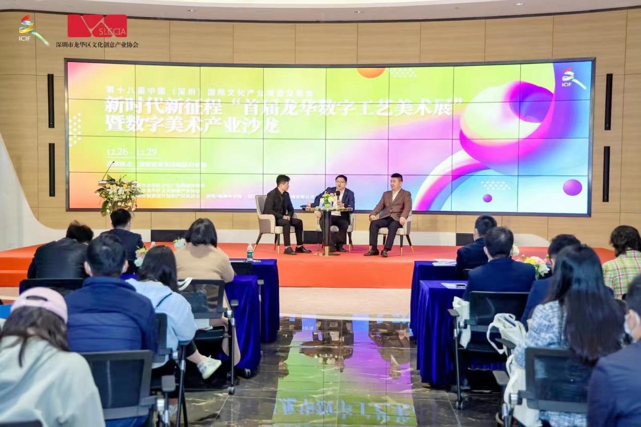随后,活动进入数字美术产业沙龙环节。沙龙在南方科技大学全球城市文明典范研究院秘书长陈能军博士主持下,国匠数字文化科技研究公司带头人曲振老师、中艺(山东)文化科技有限公司穆鹏飞监事分别就《数字技术与文化遗产保护》《构建文化IP产业链打造文化IP数字化方阵》进行圆桌讨论。陈能军从城市文明、文化产业、数字美术产业等角度与两位沙龙嘉宾围绕数字技术中的文化遗产保护、数字美术转化、文化IP产业链、数字艺术与美术产业跨界合作的爆款IP打造等话题进行深入探讨,为观众们带来一场精彩的饕餮盛宴。