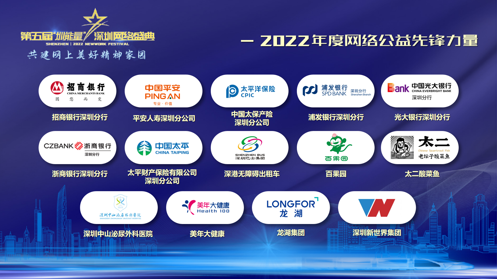 经过专家组评选,考量社会公益成效后,招商银行深圳分行、平安人寿深圳分公司、中国太保产险深圳分公司、浦发银行深圳分行、光大银行深圳分行等14家企业荣获“2022年度网络公益先锋力量”称号。