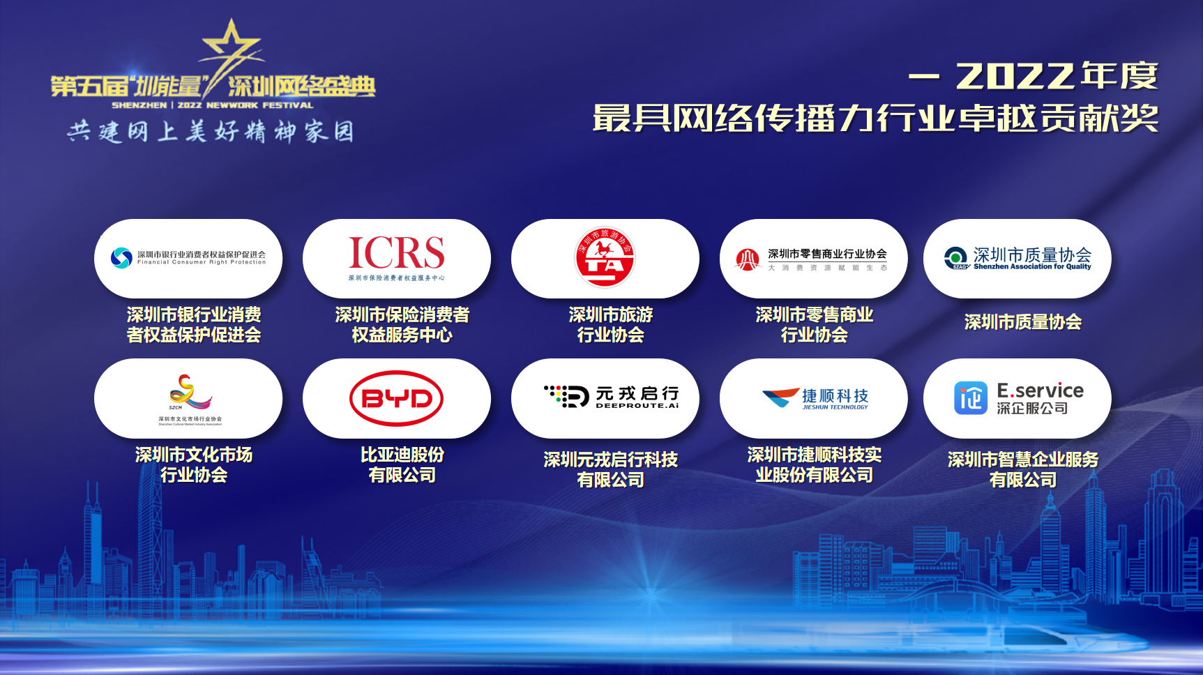 2022年,经过推荐申报及专家评选,最终深圳市银行业消费者权益保护促进会、深圳市保险消费者权益服务中心、深圳市旅游行业协会、比亚迪股份有限公司、深圳元戎启行科技有限公司等6家协会及4家企业荣获“2022最具网络传播力行业卓越贡献奖”。
