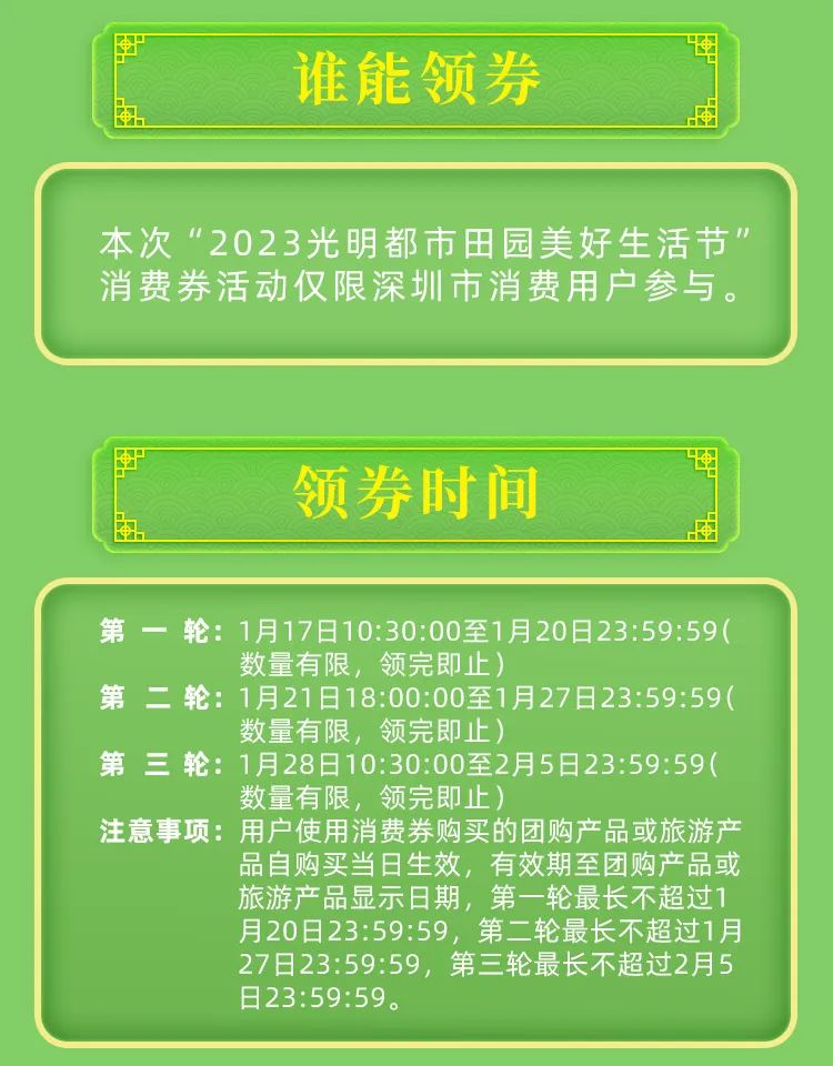@光明人,第一轮光明都市田园美好生活节文旅消费券等你来抢!一定要定好闹铃~