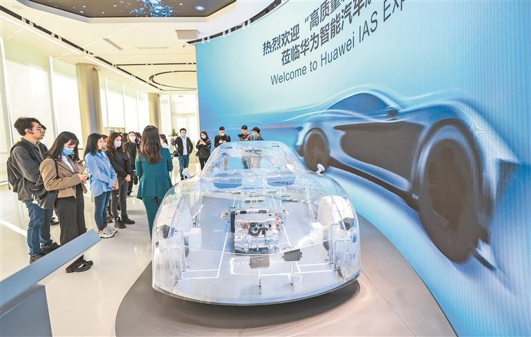 2月22日至23日,由中央网信办网络传播局指导,广东省委网信办、人民网联合主办的“未来已来·高质量发展看中国”网络主题活动开启“深圳时间”,采访团深入感受深圳的改革开放基因和科技创新特质,记录深圳高质量发展的精彩故事。图为采访团在华为智能汽车解决方案体验中心调研。深圳特区报记者 何龙 摄