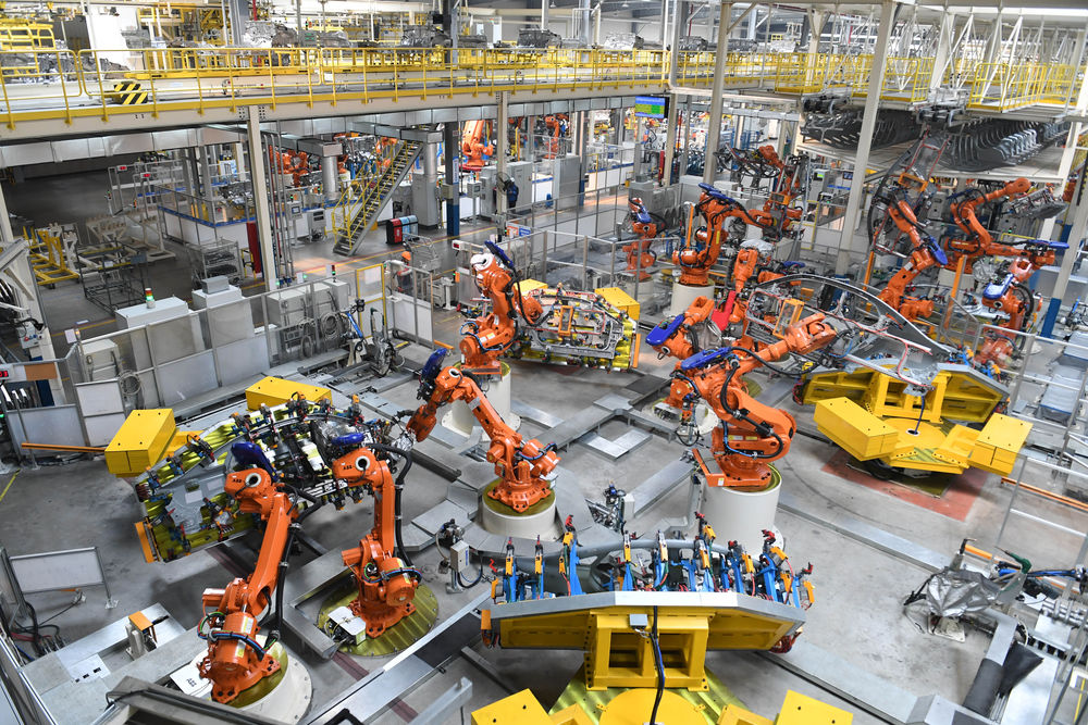 机器人在浙江临海的吉利汽车生产车间工作(2018年3月27日摄)。新华社记者 殷博古 摄