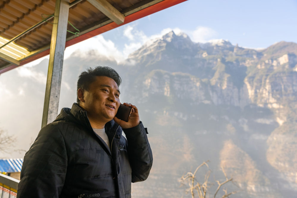 2023年2月14日,在四川省汉源县永利彝族乡古路村,郑望春通过电话与外地游客沟通来村里游览、住宿的事宜。新华社记者 沈伯韩 摄