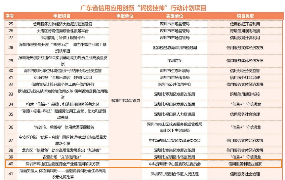 读特客户端·深圳新闻网2023年4月10日讯(记者 肖艺嘉)近日,广东省发展改革委公布了“广东省信用应用创新‘揭榜挂帅’行动计划项目”,其中坪山区委政法委(区信用办)报送的《深圳市坪山区生物医药全产业链信用解决方案》成功入选,是坪山区唯一入选的项目。