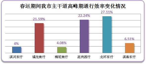 经对我市城区主干道高峰期车流量监测,预计春运期间我市早晚高峰道路日趋顺畅,全市各条主干道及进出关道路平均通行效率提高一成,北环东行、泥岗路西行行车效率提升最为明显。