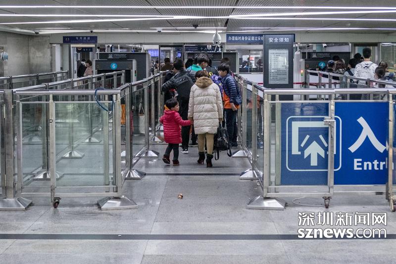 2月2日18:10深圳站广深列车进站处,旅客安检进站(实习生 关天宇摄)
