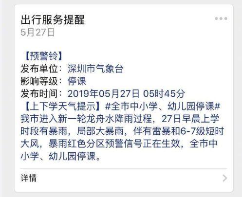 5月27日5时45分,深圳天气微信公众号发布出行服务提醒:深圳进入新一轮龙舟水降雨过程,27日早晨上学时段有暴雨,局部大暴雨,暴雨红色预警信号正在生效全市中小学、幼儿园停课。