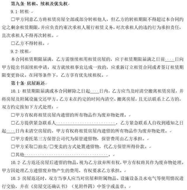4、增设承租人下落不明时,出租人对租赁房屋内的遗留物处理条款。实践中,存在很多承租人无力支付租金时断绝与出租人联系的情形。为解决出租人无法联系承租人时对租赁房屋内遗留物的处理问题,新版合同增设承租人未按约定交还房屋且下落不明时遗留物的处理条款,由双方当事人在签订合同时就此问题协商一致,避免出租人遭受无法收回房屋导致房屋使用价值无法实现的损失或者因自行处置遗留物引起纠纷、面临侵权责任的风险,有效解决承租人下落不明时租赁房屋内遗留物的处理问题。