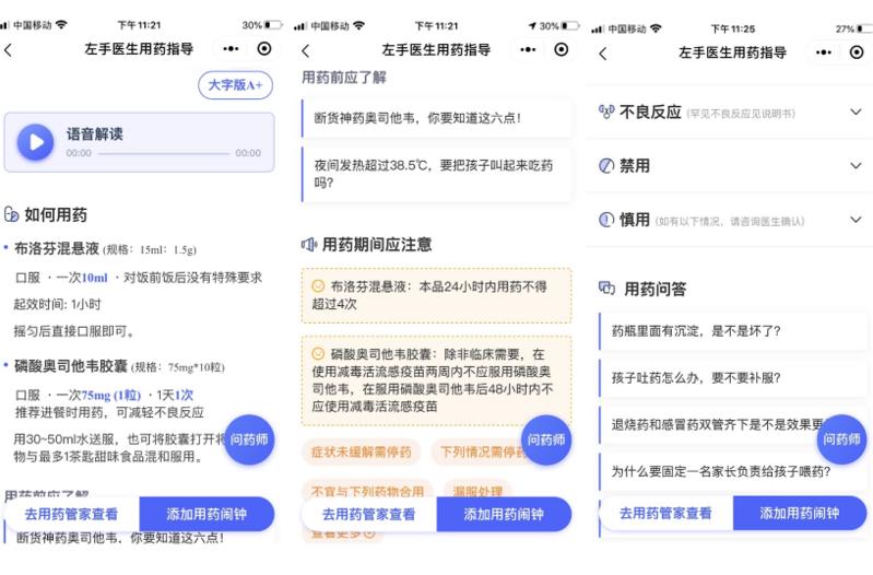 “用药管家”不仅可以解答患者什么时候用药、用药期间需要注意哪些问题、用药前必须了解什么、用药期间可能出现的情况等用药问题,而且还为患者提供了完整的药品说明书、用药视频科普、值班药师咨询、用药安排闹钟提醒语音播报等药学服务,全方位帮助患者科学用药消除用药困惑。此外,该功能还能保留下患者所有的用药记录,方便回查。