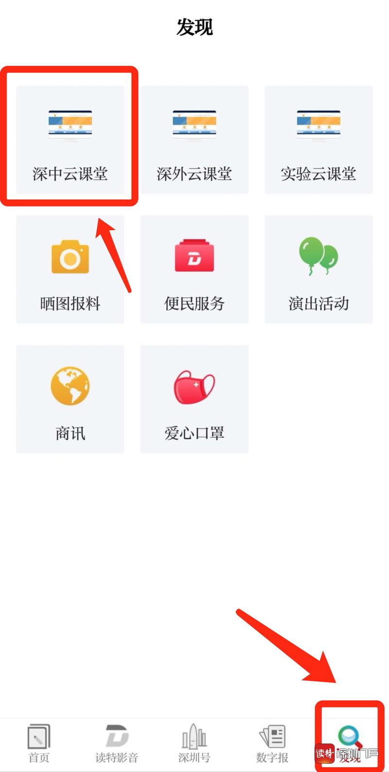“发现”频道也可直接找到“深中云课堂”
