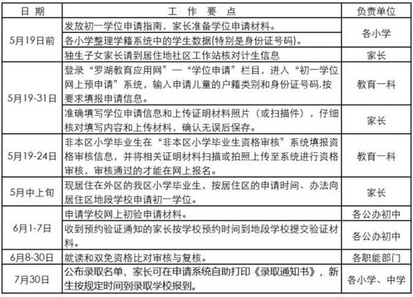 非本区小学毕业生申请罗湖区初一学位(5月19-24日资格审核)。非本区小学毕业生,符合如下条件之一的,可申请就读罗湖区初一:①罗湖户籍,家长(监护人)在学区实际居住。②本市外区户籍,家长在学区购房并实际居住;或租房有正式租赁凭证(无其他住宅房产),实际居住满一年。③非深圳户籍,家长在学区购房,实际居住满一年。符合上述条件的请于5月19-24日期间登录“罗湖教育应用网”—“学位申请”栏目“初一学位网上预申请”,进入“非本区小学毕业生资格审核”栏,填报资格审核信息,并将户籍证明(或居住证)和罗湖的住房(租房)证明、《内地居民采集》、原就读学校《小学毕业生登记表》或《学生手册》扫描或拍照上传至系统进行资格审核,审核通过的才能在罗湖区申请初一学位。④非深圳户籍,家长在学区购房实际居住不满一年、或学区租房实际居住,符合条件的参加第三阶段民办学校统筹招生。