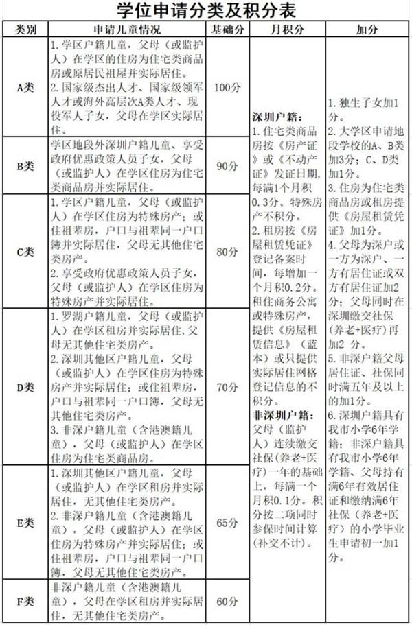 (3)加分。①独生子女加1分。②实行大学区招生的地段,申请原地段学校的A、B类加3分;C、D类加1分。③住房为住宅类商品房或租房提供《房屋租赁凭证》加1分。④父母为深户或一方为深户、一方有居住证或双方有居住证加2分;父母同时在深圳缴交社保(养老+医疗)再加2分。⑤非深户籍父母居住证、社保同时满五年及以上的加1分。⑥深圳户籍具有我市小学6年学籍,非深户籍具有我市小学6年学籍、父母持有满6年有效居住证和缴纳满6年社保(养老+医疗)的小学毕业生申请初一加1分。