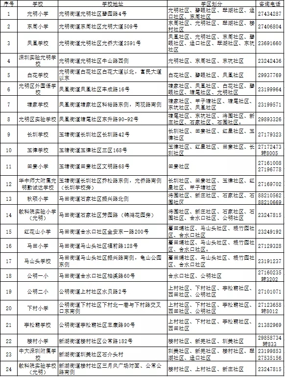 (二)光明区2020年公办小学学区划分及咨询电话