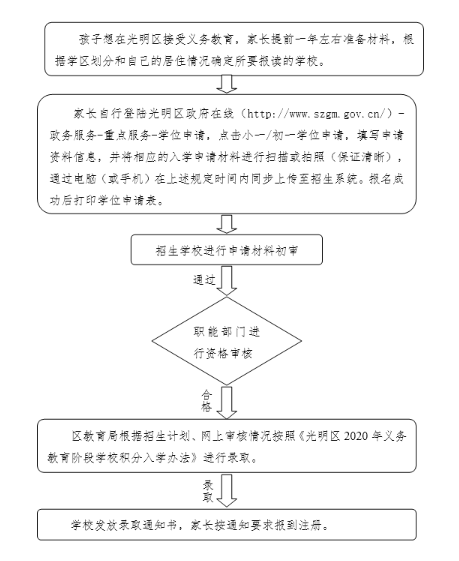 区教育局根据招生计划、网上审核情况,按照《光明区2020年义务教育阶段学校积分入学办法》进行录取。各义务教育学校在学校门口张榜公布录取名单,并及时通知家长注册事宜。