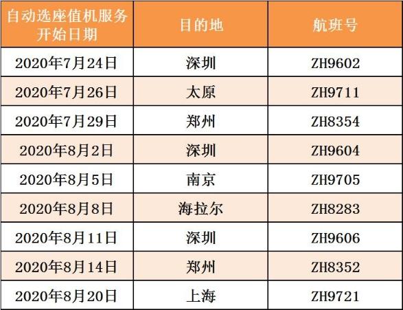 此外,7月24日起,深航为沈阳出发的部分航班提供自动选座值机服务。若乘坐开通自动选座值机服务航班的经济舱,在航班起飞前4小时时仍未值机,航空公司将自动为旅客分配座位并以短信形式告知。目前服务实行计划航班如下:
