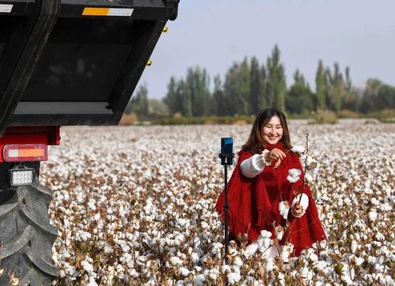 网络主播在棉田推介新疆棉花。新华社记者赵戈摄