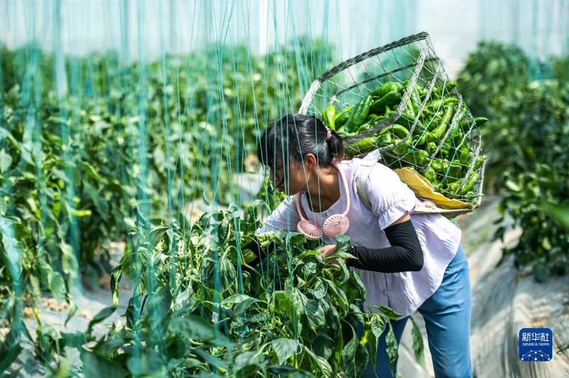 村民在贵阳农投集团奇申蔬菜基地采收牛角椒(7月29日摄)。