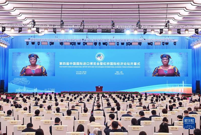 11月4日晚,第四届中国国际进口博览会开幕式在国家会展中心(上海)举行。这是世界贸易组织总干事伊维拉在开幕式上以视频方式致辞。新华社记者李响摄