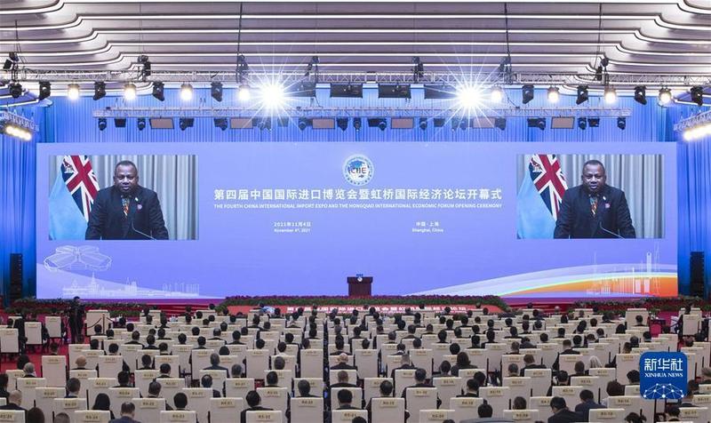 11月4日晚,第四届中国国际进口博览会开幕式在国家会展中心(上海)举行。这是斐济代理总理塞鲁伊拉图在开幕式上以视频方式致辞。新华社记者金立旺摄