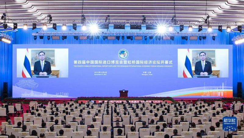 11月4日晚,第四届中国国际进口博览会开幕式在国家会展中心(上海)举行。这是泰国总理巴育在开幕式上以视频方式致辞。新华社记者金立旺摄