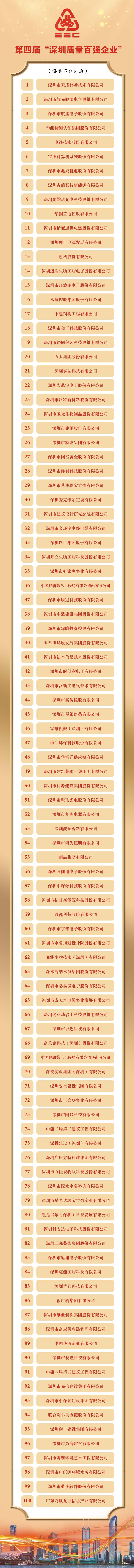 据了解,“深圳质量百强企业”评选由深圳市企业联合会、深圳市企业家协会联合多家单位举办,深圳市市场监督管理局等部门指导,每三年一届,是深圳企业贯彻经济转型升级高质量发展战略,加快建设粤港澳大湾区和中国特色社会主义先行示范区,推动落实质量强市战略的重要举措。