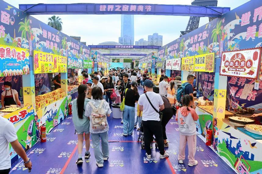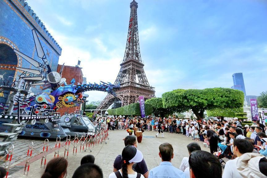 景区内,世界风情演艺全面开花,超百场演艺在景区各处上演,《出埃及记》《泰姬陵恋歌》等世界各地的风情演艺让游客大饱眼福,给游客带来零距离沉浸式文化体验。在环球舞台,世界广场座无虚席,世界狂欢大巡游时尚热烈、激动人心,身着盛装的演员们活力四射,伴着节拍、踩着舞步登上巡游舞台,与游客欢乐互动。埃菲尔铁塔下,“WoW潮音嘉年华”音乐节火热开启,潮流人气乐队、电音派对掀起狂欢高潮。