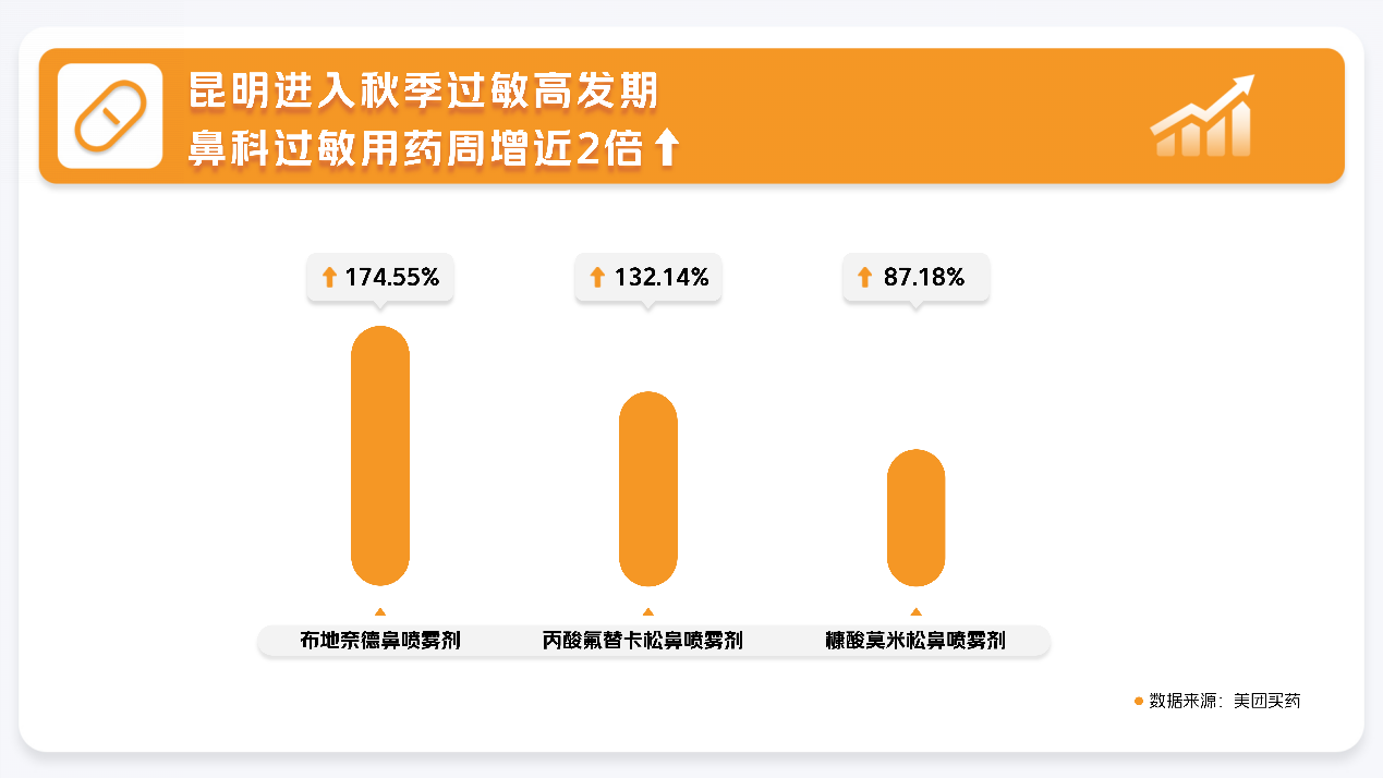 持续一个多月的过敏季也由南向北,发展到了昆明。美团买药健康指数显示,昆明市布地奈德鼻喷雾剂需求本周增长近2倍,丙酸氟替卡松鼻喷雾剂需求周增1.3倍,糠酸莫米松鼻喷雾剂相比上周增长超87%。