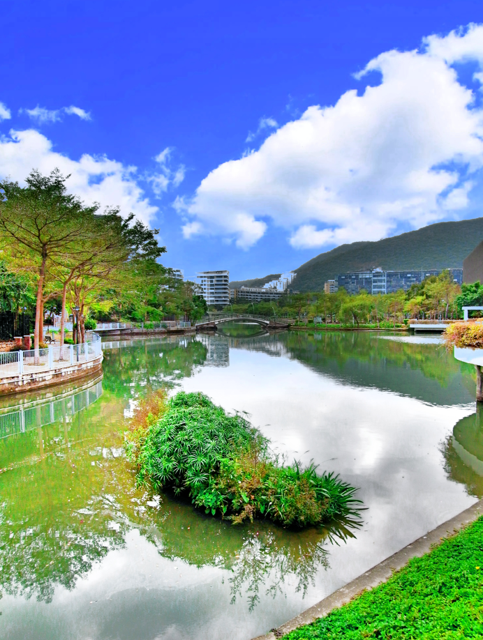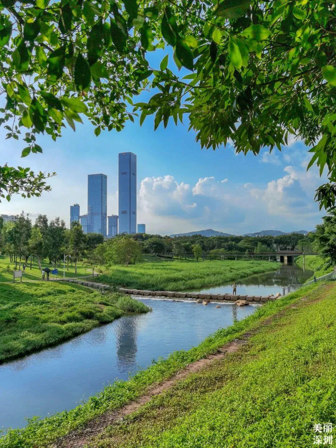福田河碧道中心公园段设置亲水汀步、亲水步道等,让市民在安全的情况下进行嬉水活动,还有大片草坪供市民露营游玩,是闹市中的天然绿化带。