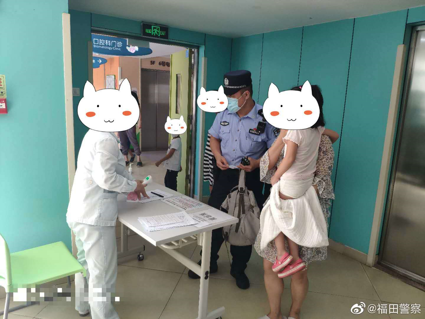 7月18日,深圳市公安局福田分局通心岭派出所民警赖卫东巡逻至某路段时,遇到一名抱着孩子,急匆匆在路边拦车的女士。被抱着的小女孩下巴有明显伤势,并且溢出鲜血。