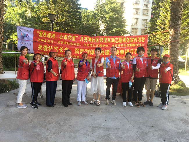 8月9日下午,月亮湾社区“爱在港湾,心系邻里”月亮湾邻里互助志愿者服务宣传活动在月亮湾社区花园小广场举办。