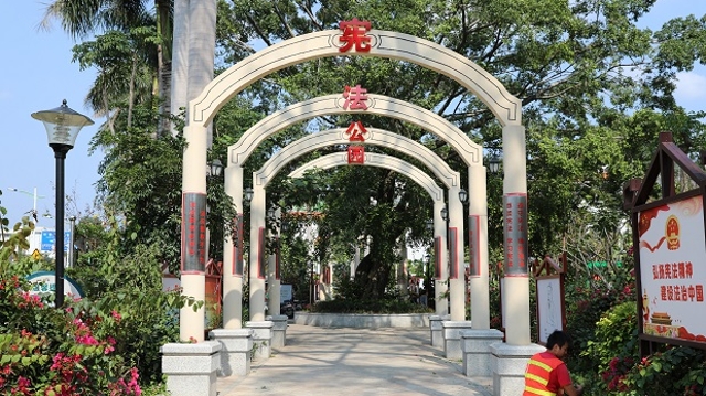 “带着孩子来逛公园,不仅玩得开心,还能学到不少法律知识。”星期六,杨大妈坐在“榕话亭”的石凳上,笑眯眯的看着孙子和一群小朋友在大榕树下玩耍。在深圳市大鹏新区葵涌办事处的葵涌宪法主题公园,不少居民群众非常喜欢这里浓厚的法律氛围。